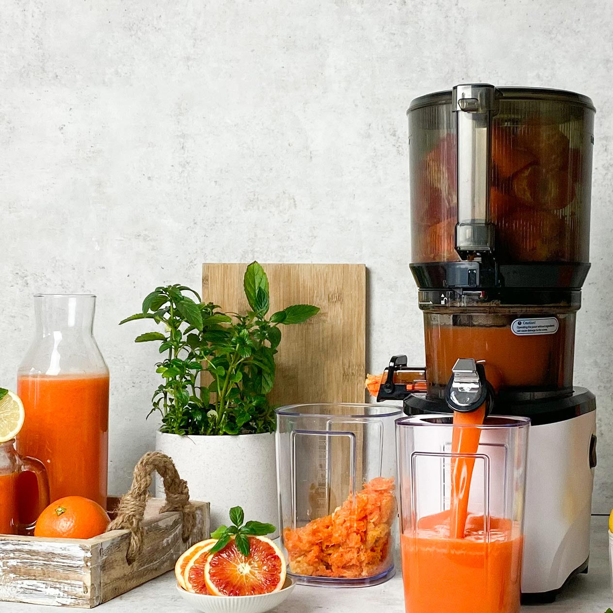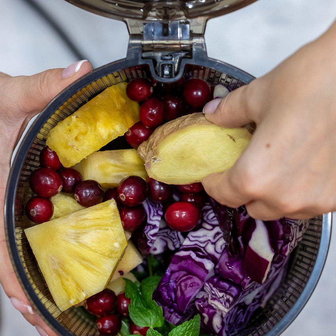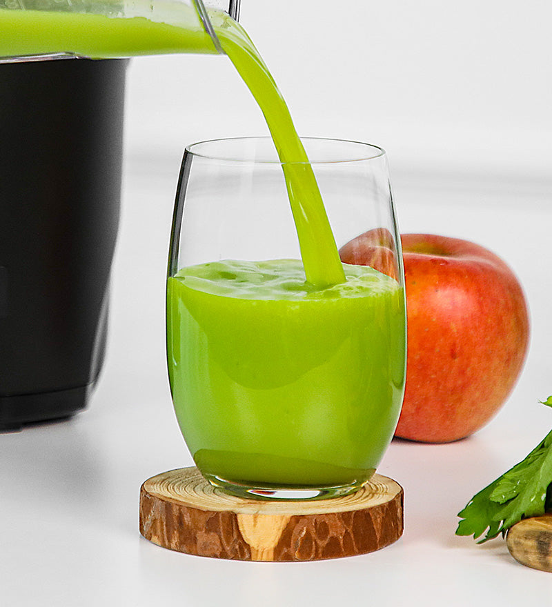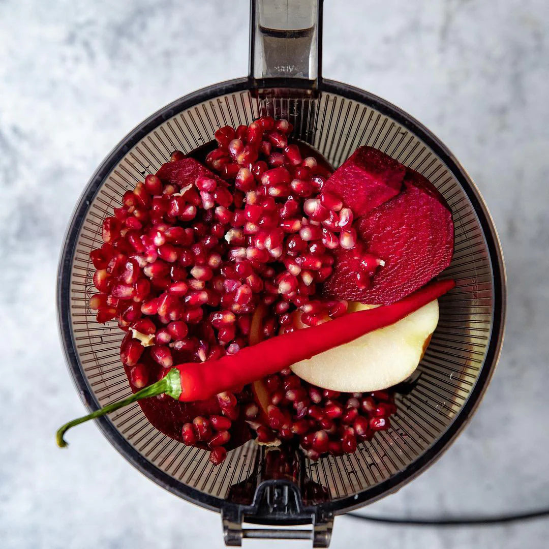 The cold-press technology operates at a quiet 43 RPM, preserving nutrients while extracting up to 95% juice yield, leaving minimal pulp