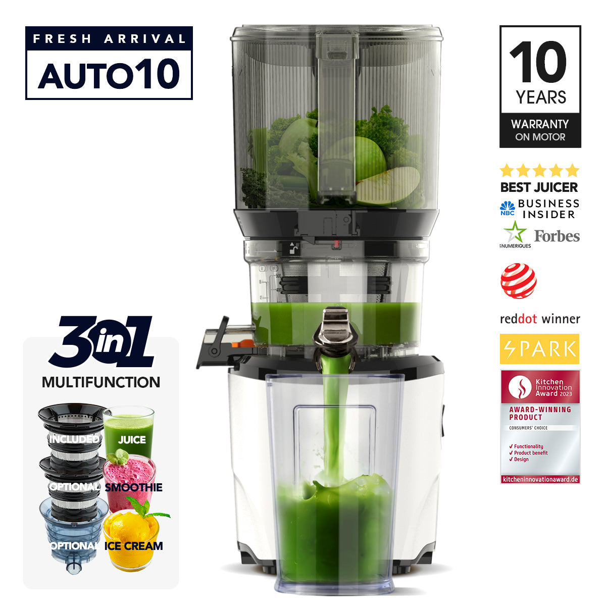 I love how compact this juicer is. It’s sturdy, durable, and produces high-yield, excellent-quality juice. I especially appreciate the wide chute design, which allows me to add whole fruits and saves a lot of prep and cutting time. Another great feature is that the entire machine except for the motor - can be easily disassembled for quick cleaning after use. The motor is also impressively quiet while juicing. Overall, I’m extremely satisfied and happy with this new juicer.