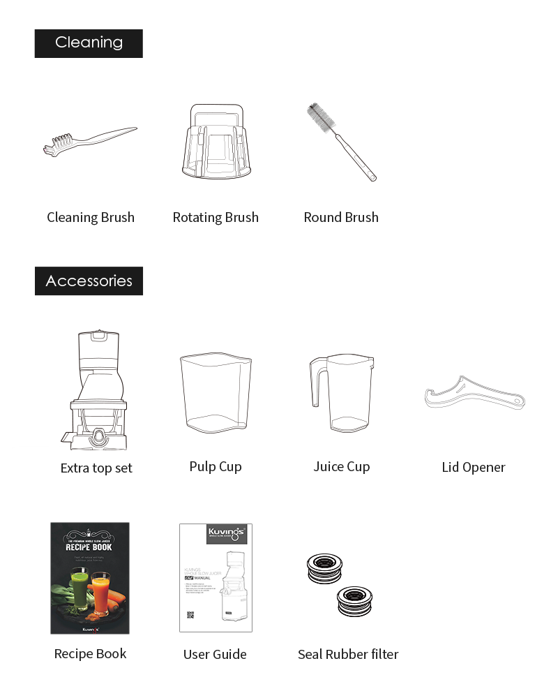 What's in the box :2 TOP Sets, Cleaning Brush, Rotation Brush, Round Brush, Juicing Strainer, Juice Jug, Pulp Jug, Lid Opener, Recipe Book, CS600 Manual, Seal Rubber filter