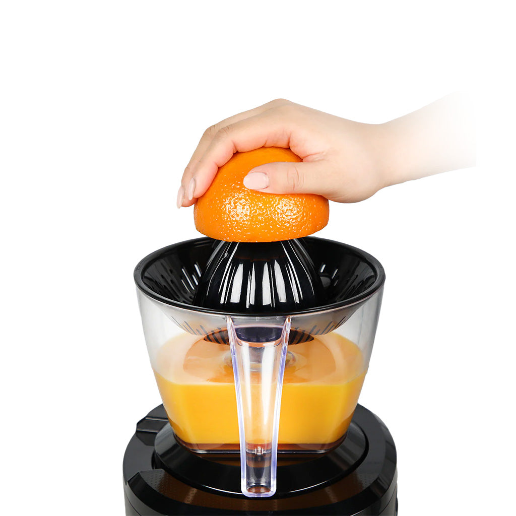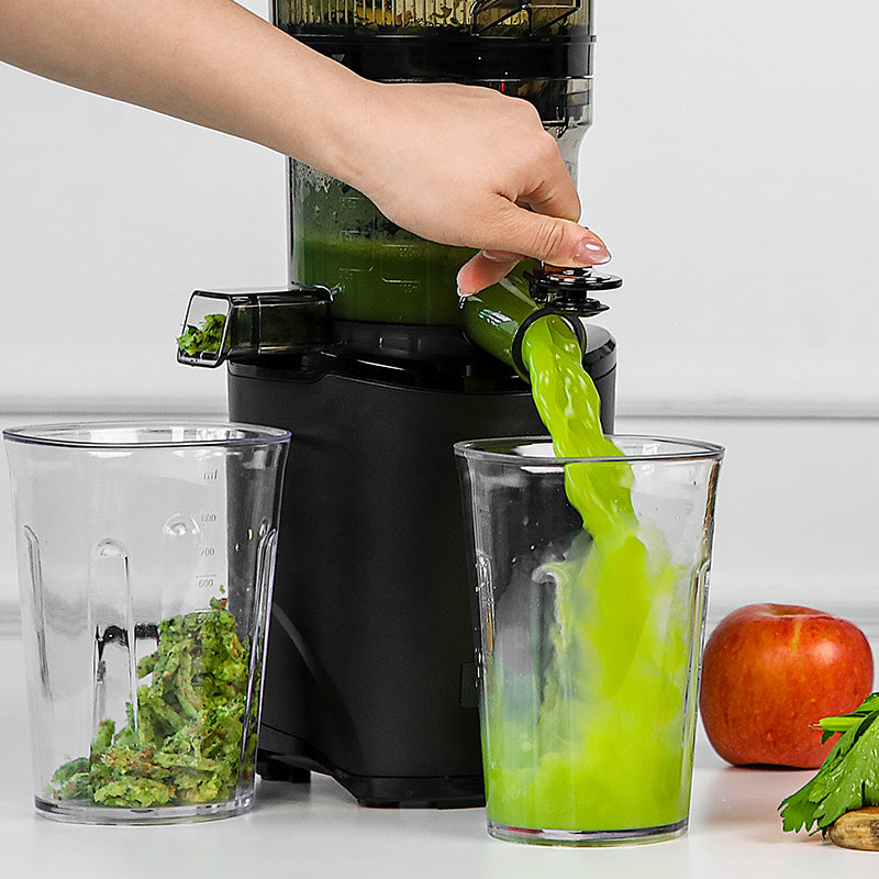 The cold-press technology operates at a quiet 43 RPM, preserving nutrients while extracting up to 95% juice yield, leaving minimal pulp